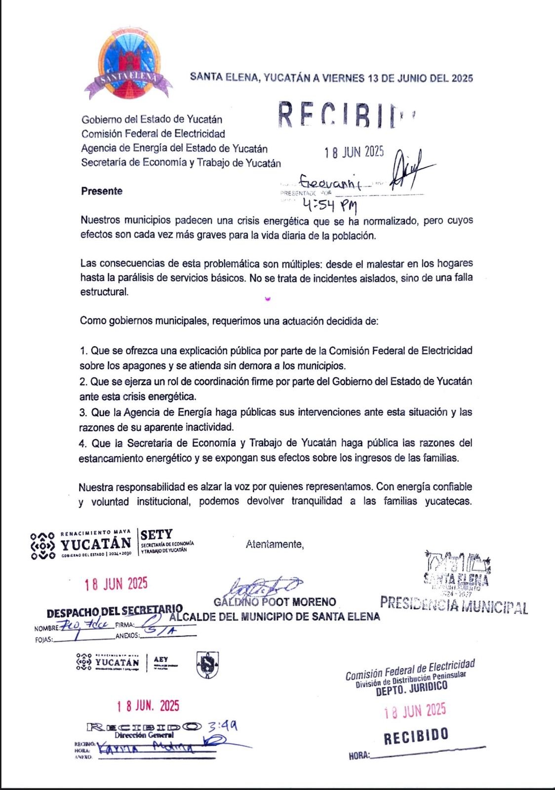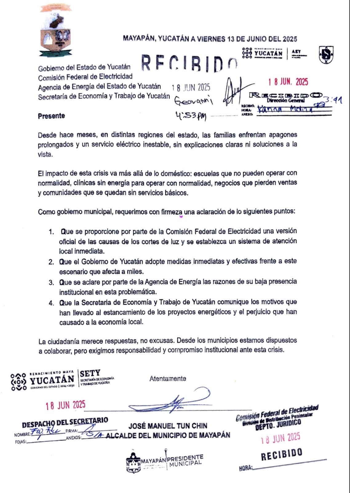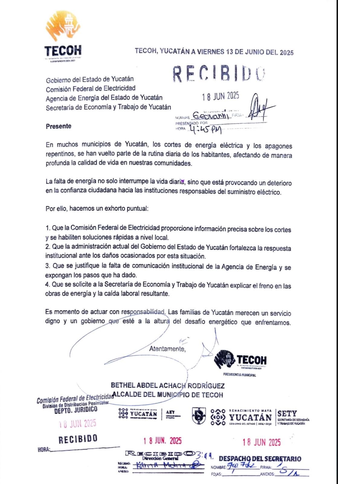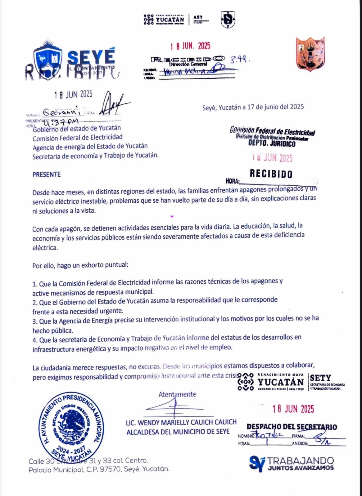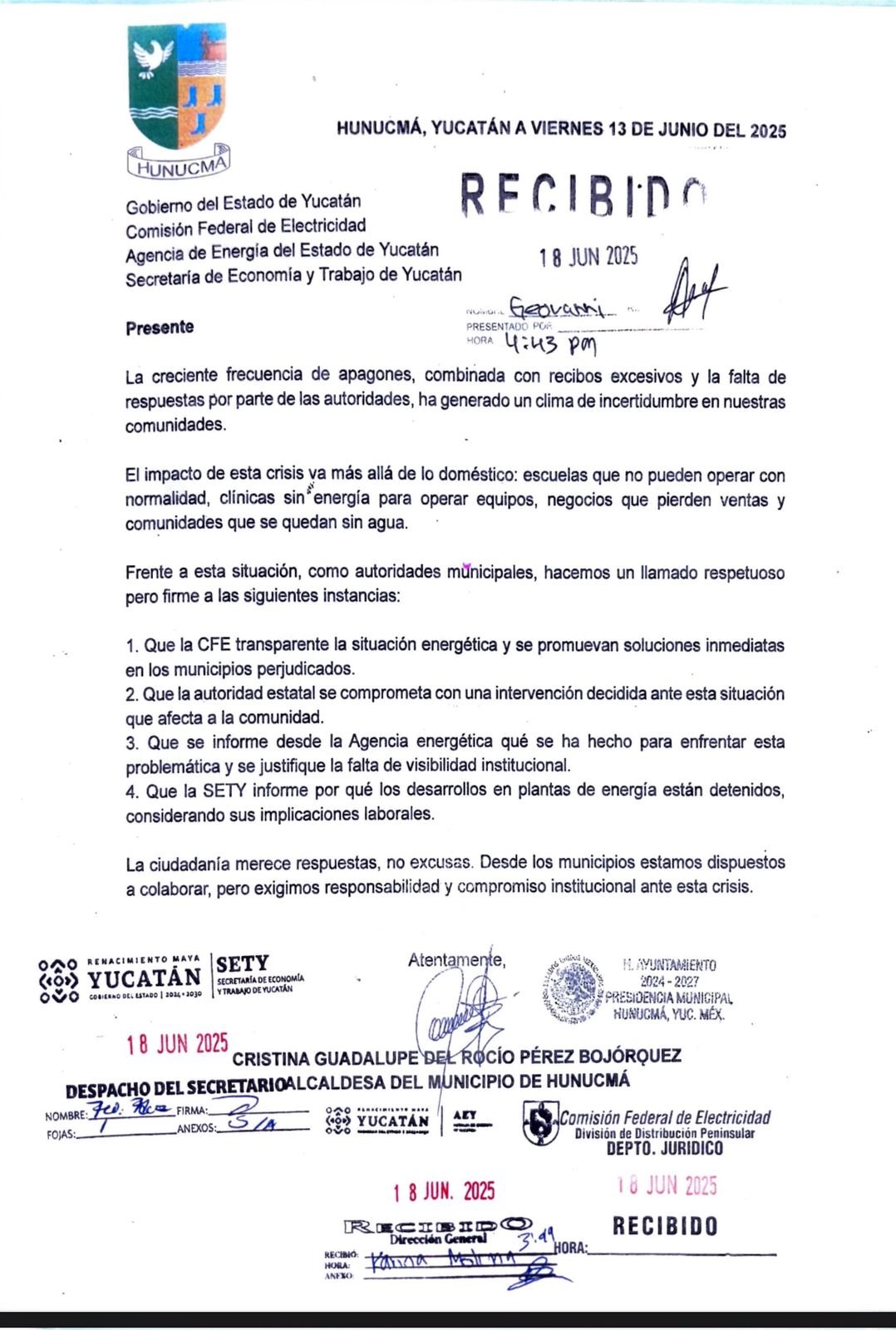 Los ediles entregaron oficios dirigidos a la Comisión Federal de Electricidad (CFE), al Gobierno del Estado, a la Secretaría de Economía y Trabajo (SETY) y a la Agencia de Energía, solicitando atención urgente, información técnica clara y medidas inmediatas para atender el problema.