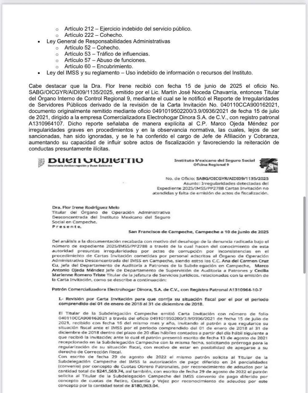 Campeche, agosto de 2025.- Una presunta red de corrupción estructural al interior del Instituto Mexicano del Seguro Social (IMSS) en Campeche ha sido denunciada ante el Órgano Interno de Control (OIC), según información publicada por Noticias Cd del Carmen y el Sureste. La denuncia revela simulación de contratos, adjudicaciones irregulares y manipulación de procesos internos, afectando la integridad institucional y los derechos de los derechohabientes.