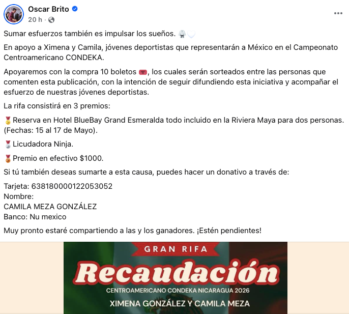 En esta ocasión, el legislador presumió en sus plataformas digitales un supuesto respaldo al deporte, al anunciar la compra de 10 boletos de una rifa organizada por dos jóvenes taekwondoinas yucatecas que buscan reunir recursos para representar a México en el Campeonato Centroamericano CONDEKA, que se realizará en marzo en Nicaragua. Cada boleto tiene un costo de 200 pesos, lo que se traduce en un apoyo real de apenas 2 mil pesos.