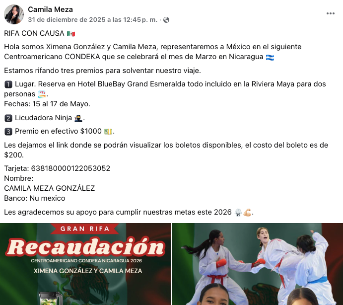 Las atletas, Ximena González y Camila Meza, recurrieron a una rifa con causa ante la falta de respaldo institucional suficiente para cubrir gastos de viaje, hospedaje y competencia. Entre los premios destacan una estancia en un hotel de la Riviera Maya, una licuadora y un premio en efectivo, todo con el objetivo de financiar su participación internacional.