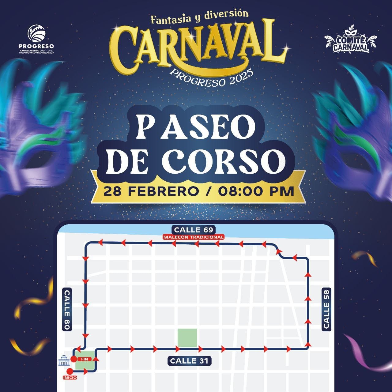 El viernes 28 de febrero, los festejos continuarán con dos grandes desfiles. A las 4:00 p.m. se llevará a cabo el Paseo Infantil, que comenzará en el parque de Las Madres, recorrerá la calle 31 y finalizará en el parque central. A las 8:00 p.m. se realizará el Paseo de Corso, que saldrá de los bajos del Palacio Municipal, avanzará por la calle 31, tomará la calle 58 y concluirá en el Malecón Tradicional, para terminar nuevamente en la calle 80.
