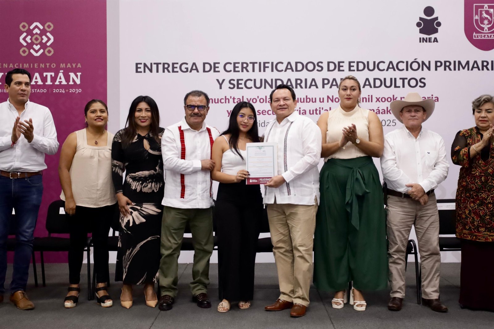 El Gobernador de Yucatán, Joaquín Díaz Mena, y el Director General del Instituto Nacional para la Educación de los Adultos (INEA), Armando Contreras Castillo, encabezaron este jueves la entrega de 40 certificados de educación primaria y secundaria a adultos, en un esfuerzo conjunto para reducir el rezago educativo y el analfabetismo en la entidad.
