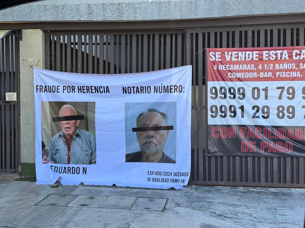 En dichas lonas, con rostros cubiertos por cuestiones legales, se menciona a un individuo identificado como “Eduardo N” y a su notario, quienes habrían participado en la elaboración de un testamento presuntamente falso.
