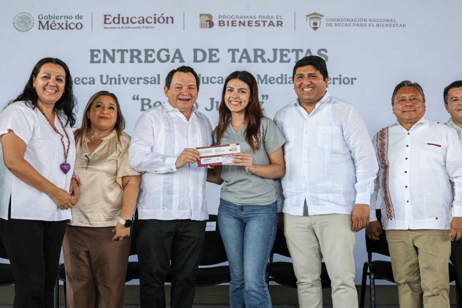 Acompañado del delegado de Programas de Bienestar en Yucatán, Rogerio Castro Vázquez, el mandatario otorgó estas tarjetas del Banco del Bienestar, a través de las cuales las y los beneficiarios recibirán mil 900 pesos bimestrales durante todo el ciclo escolar, por un periodo de hasta 30 meses.