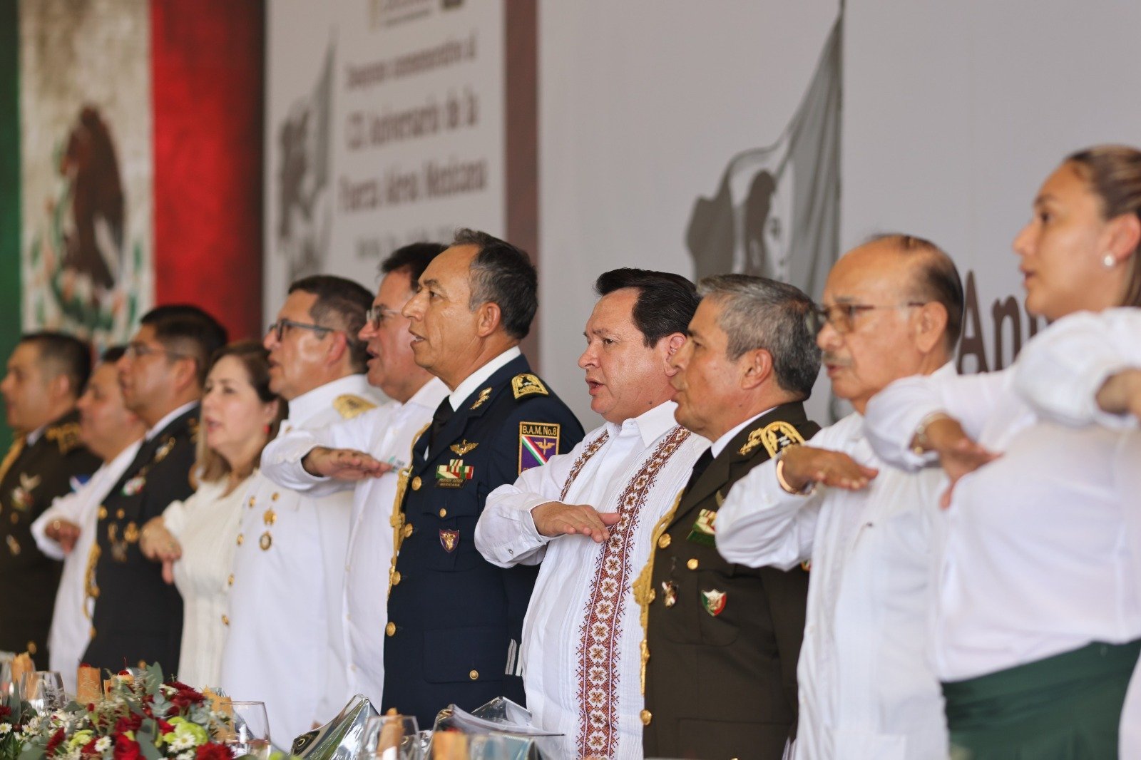 En el marco del 110 aniversario de la Fuerza Aérea Mexicana (FAM), celebrado en el hangar del Escuadrón Aéreo 109 de la Base Aérea Militar Número 8 en Mérida, el Gobernador Joaquín Díaz Mena rindió homenaje a los integrantes de la institución encargada de salvaguardar el espacio aéreo de México y, por ende, la seguridad de los ciudadanos.