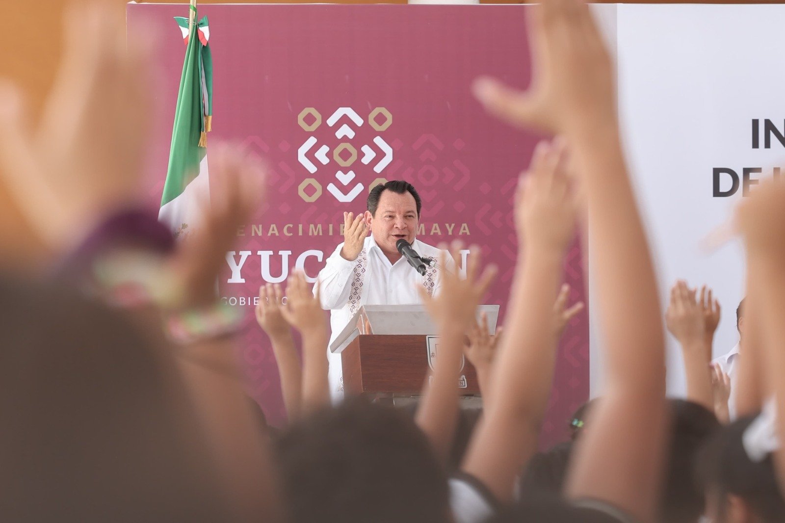 El mandatario estatal estuvo acompañado por los titulares de la Secretaría de Educación del Gobierno del Estado (SEGEY), Juan Balam Várguez, y de la Secretaría de Infraestructura para el Bienestar, Alaine López Briceño. Durante su intervención, también anunció la construcción de una nueva aula de cómputo en la escuela, así como la incorporación de un docente de lengua maya, en respuesta a solicitudes directas de la comunidad educativa.