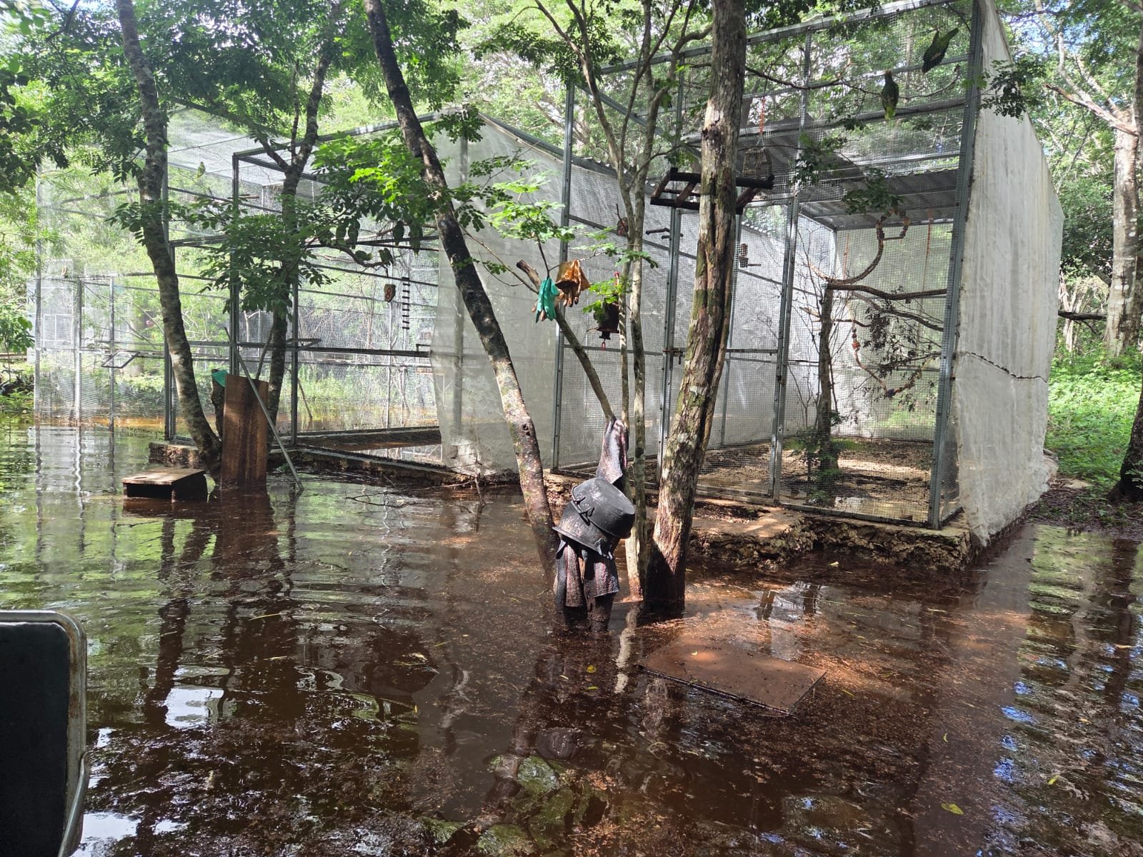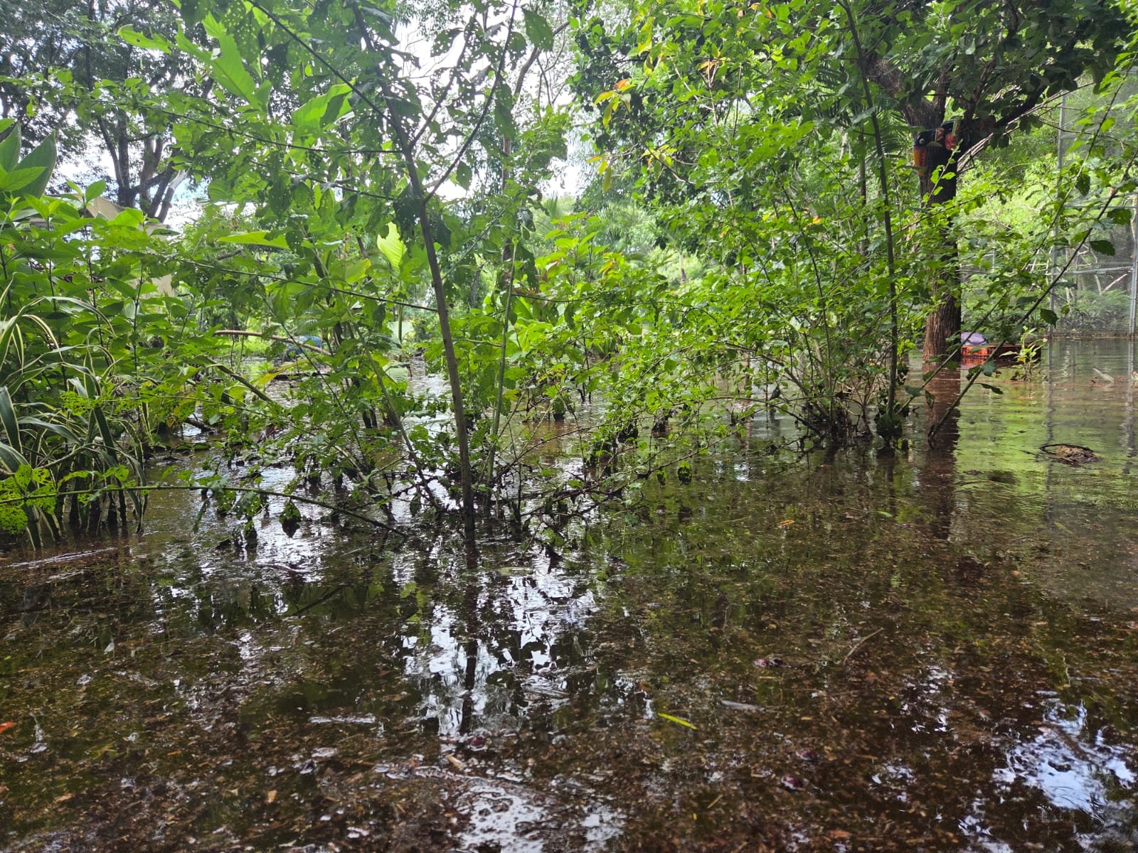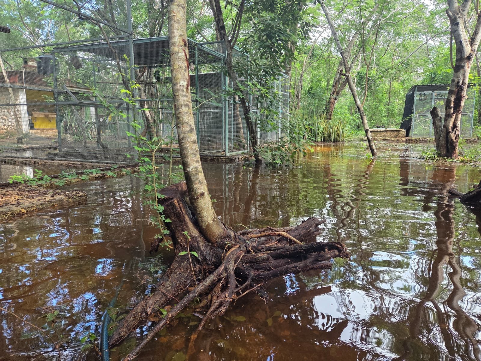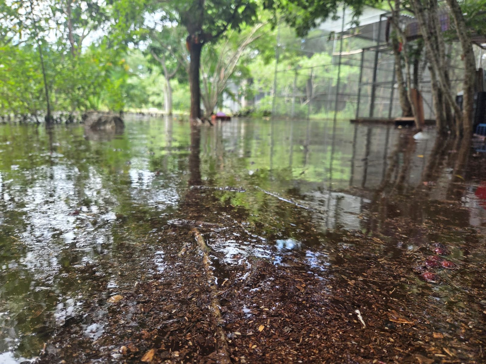 De acuerdo con el ambientalista, a pesar de la magnitud del encharcamiento, las aves se encuentran fuera de peligro gracias a la infraestructura recientemente construida en el lugar. “La altura de las voladeras nuevas evita cualquier riesgo para los loros, guacamayas y pericos, quienes únicamente observan desde lo alto lo que ocurrió, sin sufrir ninguna afectación”, explicó.