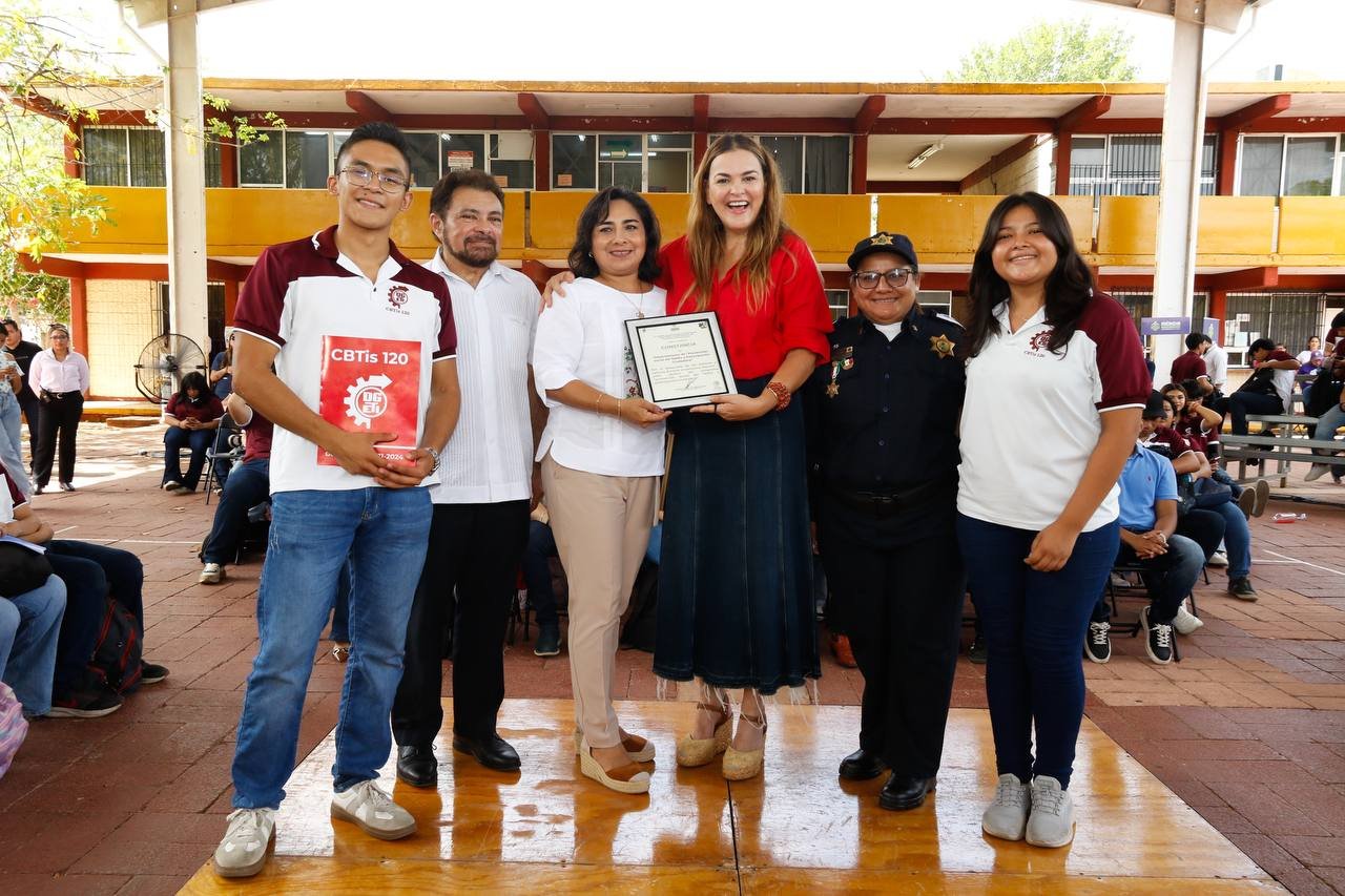 Este martes, la presidenta municipal visitó el Centro de Bachillerato Tecnológico Industrial y de Servicios (CBTIS) No. 120, donde sostuvo un diálogo directo con la comunidad estudiantil, escuchó sus inquietudes y destacó la importancia de impulsar acciones integrales desde las escuelas para construir entornos seguros y saludables para las juventudes.